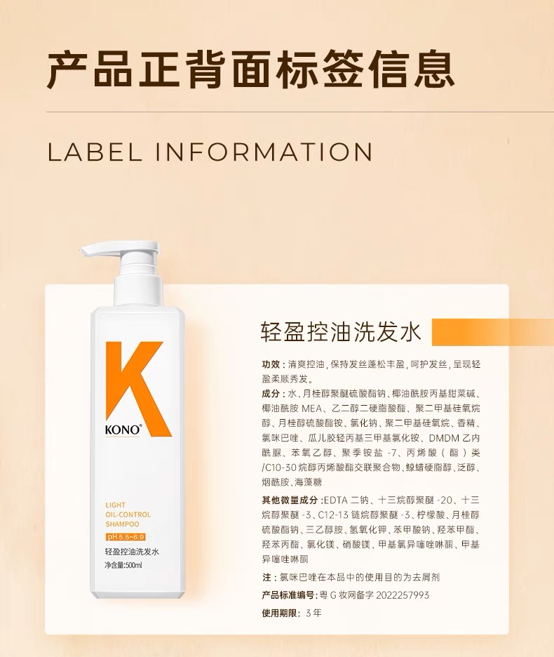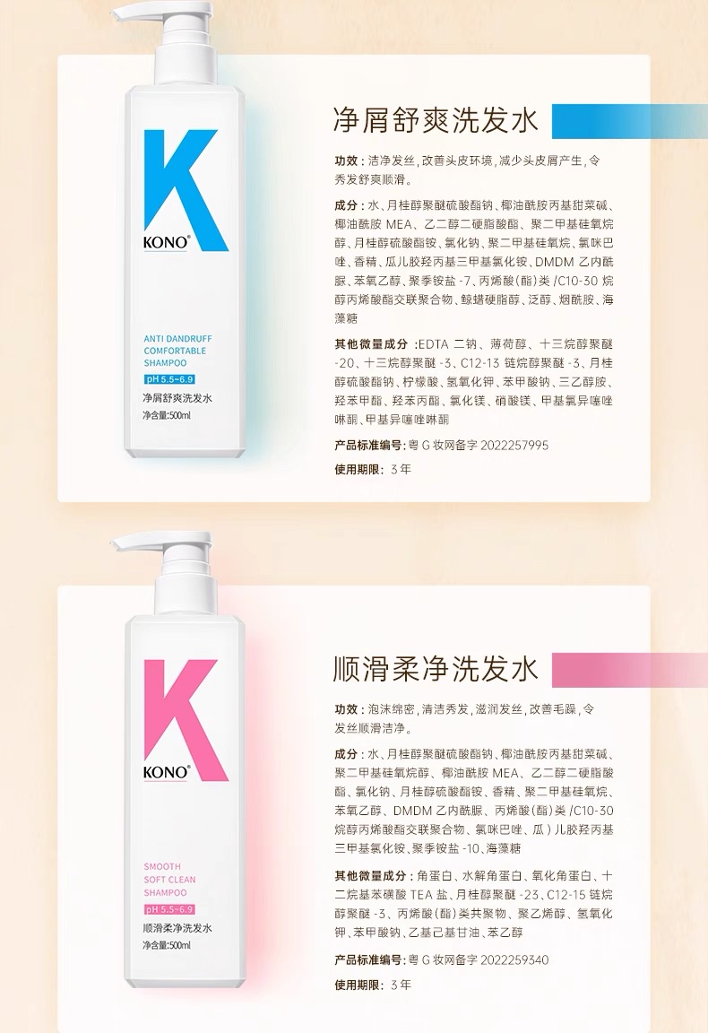 KONO洗发水经典款净屑舒爽(蓝瓶)500ml+经典款轻盈控油(橙瓶)500ml